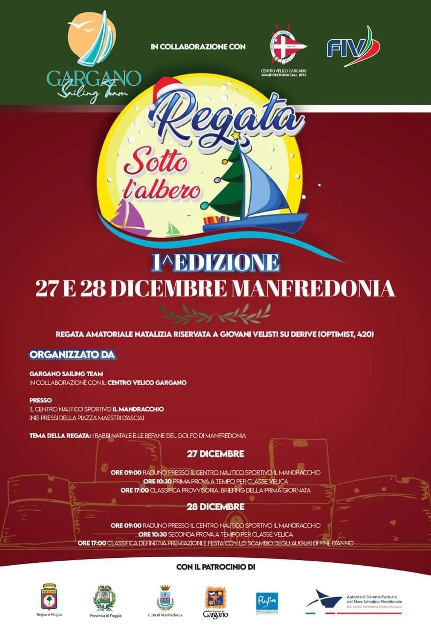 La società sportiva Gargano Sailing Team in collaborazione con il Centro Velico Gargano di Manfredonia, entrambe società affiliate FIV, daranno vita i prossimi 27 e 28 dicembre ad un altro evento originale: la Regata sotto l’Albero. Un appuntamento che vedrà giovani velisti sfidarsi nelle acque del golfo di Manfredonia addobbando le proprie imbarcazioni con decori natalizi e travestendosi da Babbo Natale e Befane.
