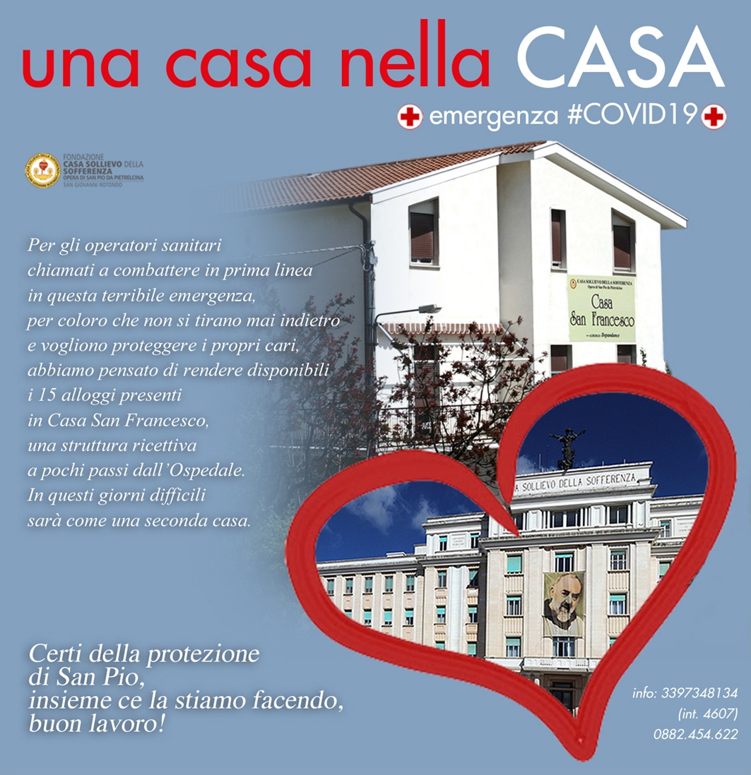 “Una casa nella Casa” riapre, quindi, mettendo a disposizione di chi ne farà richiesta i 15 alloggi di “Casa San Francesco”, una struttura ricettiva a poche centinaia di metri dall’Ospedale. L’iniziativa è anche un modo per ringraziare tutti i professionisti che non si tirano mai indietro di fronte alle difficoltà. A loro va tutta la riconoscenza dell’IRCCS Casa Sollievo della Sofferenza e le preghiere di sostegno e di incoraggiamento di un’intera comunità.