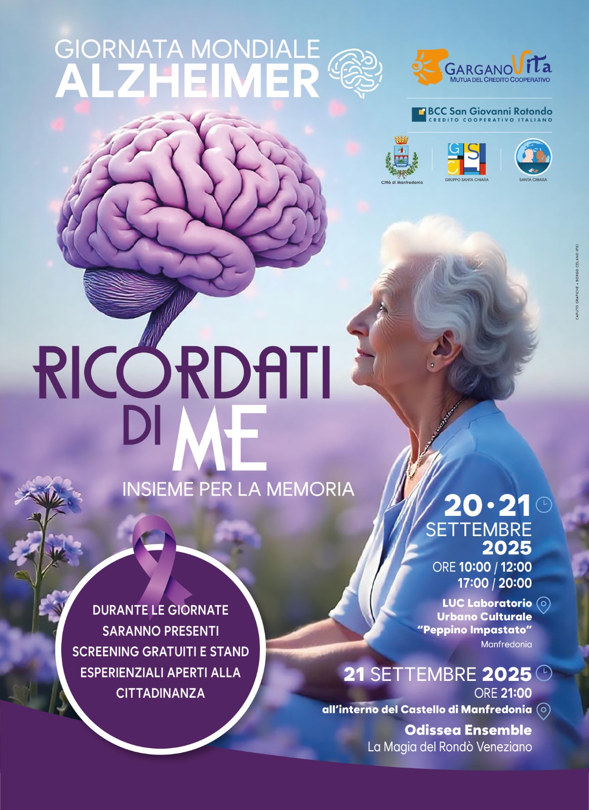 In occasione della Giornata Mondiale dell’Alzheimer, la Banca di Credito Cooperativo di San Giovanni Rotondo, la mutua del Credito Cooperativo, Gargano Vita, e la Cooperativa Santa Chiara, con il patrocinio del Comune di Manfredonia, promuovono l’iniziativa “Ricordati di me – Insieme per la memoria”, in programma il 20 e 21 settembre 2025 nella città sipontina.