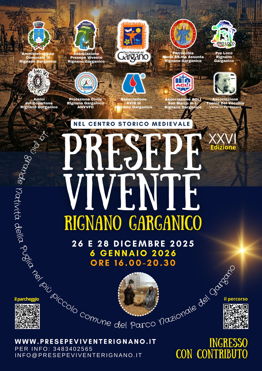 Anche quest’anno, i vicoli antichi di Rignano Garganico si preparano a fermare il tempo. Arriva alla sua XXVI Edizione il Presepe Vivente, un evento che ormai rappresenta una tradizione consolidata e un punto di riferimento per il turismo invernale pugliese.