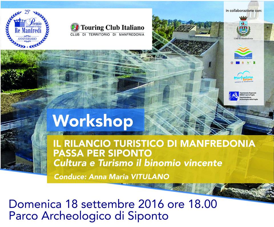 Domenica 18 settembre le “Basiliche” di Siponto saranno protagoniste e al tempo stesso spettacolari elementi scenografici del workshop organizzato dal Touring Club Italiano – Club territorio di Manfredonia e dalla Fondazione Premio Re Manfredi, in collaborazione con la Città di Manfredonia, il Gal Daunofantino, l’Agenzia del Turismo di Manfredonia e il Segretariato regionale Mibact per la Puglia, sul tema “Il rilancio turistico di Manfredonia passa per Siponto – Cultura e turismo binomio vincente”.