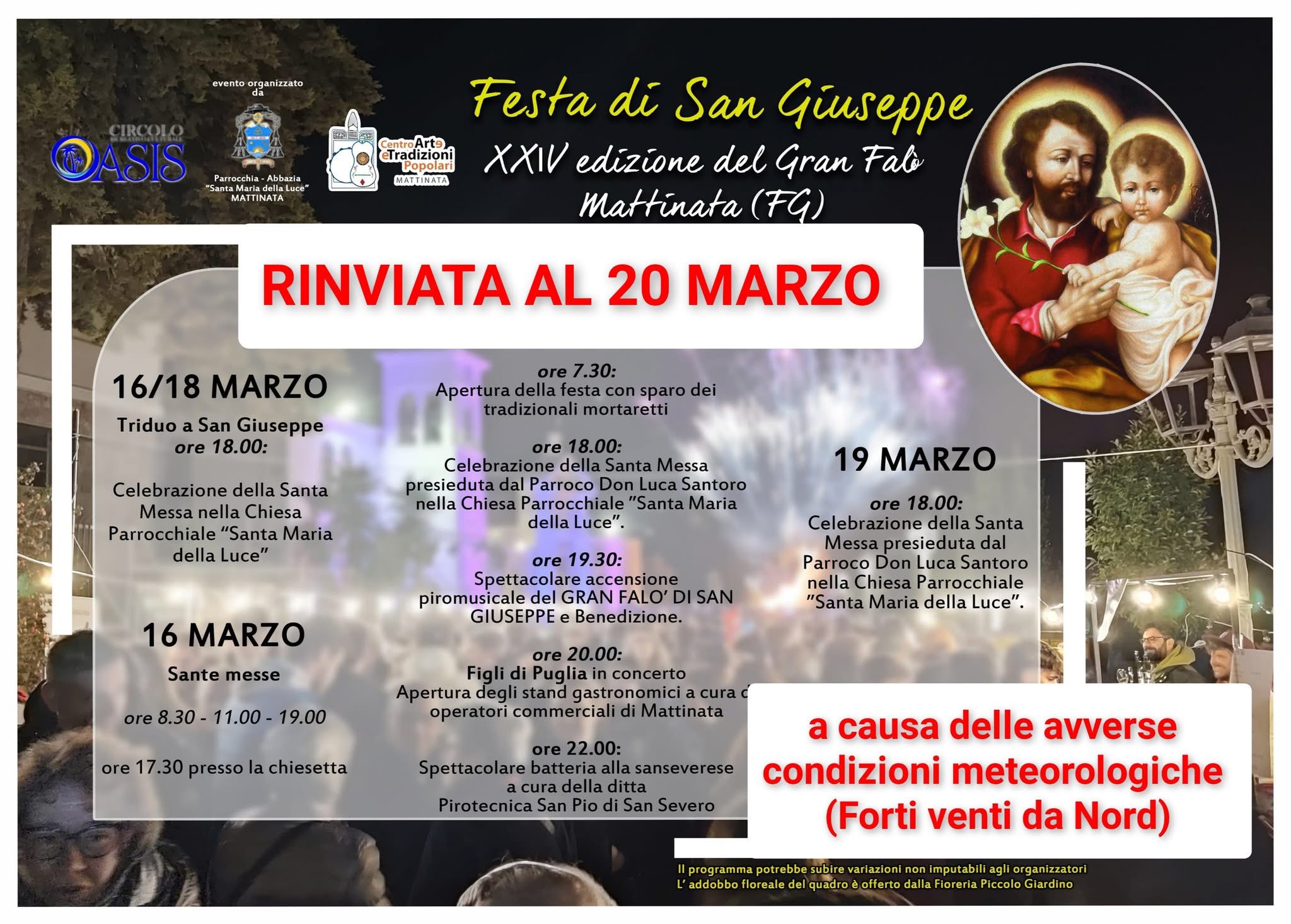 Rinviate al 20 marzo le manifestazioni per San Giuseppe a Mattinata