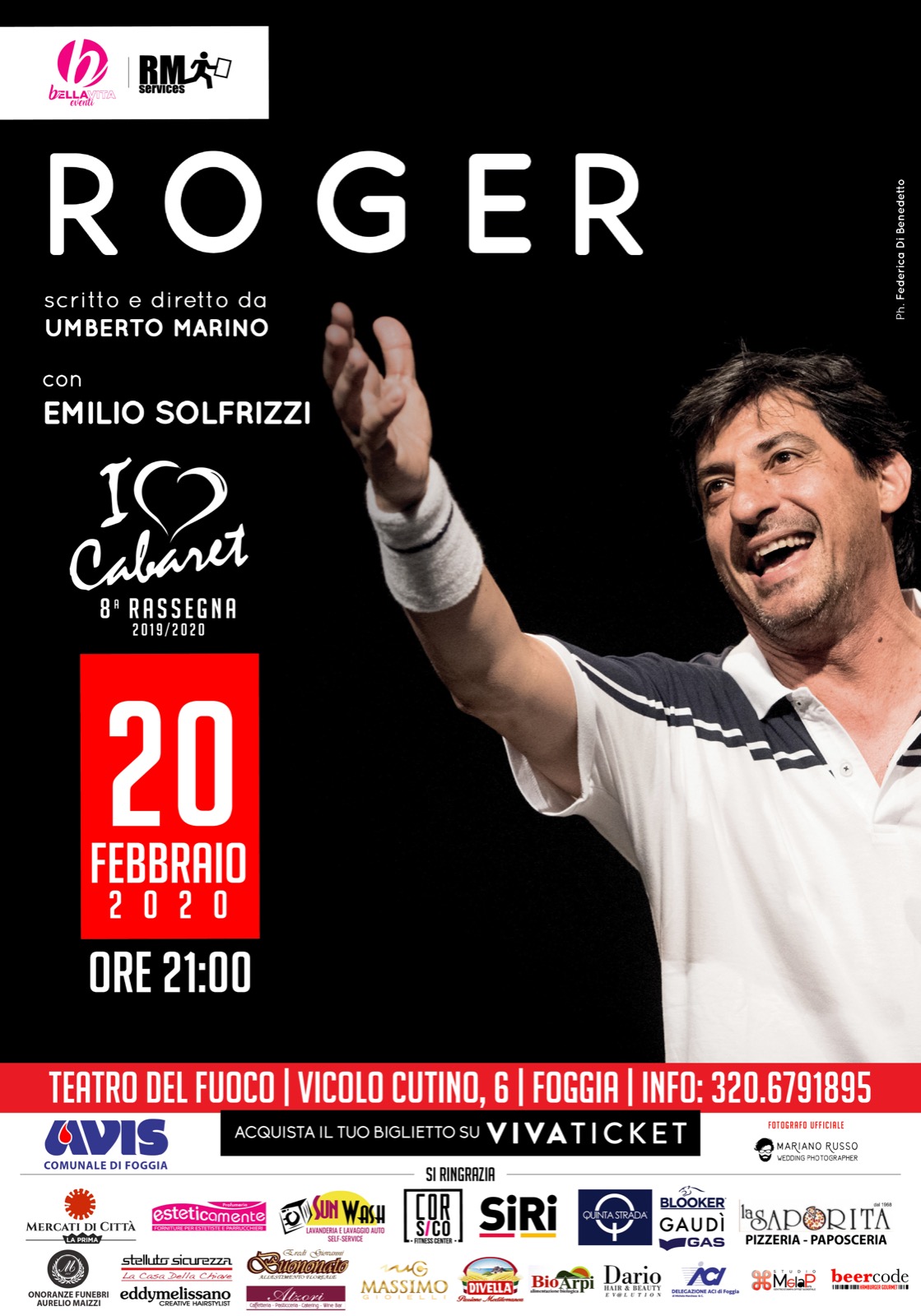 Immaginate, allora, le racchette, le palline, i lungolinea, i colpi, i micidiali rovesci e le volée. Perché in scena non ci saranno. Resteranno, infatti, solo le parole, solo un lungo, divertente, ironico, dissacrante racconto. Emilio Solfrizzi è il numero 2, è lo sfidante che, con energia debordante, degna davvero di un grande tennista, si mette in gioco nella partita dell’anno, con quel Roger (Federer) modello irraggiungibile.