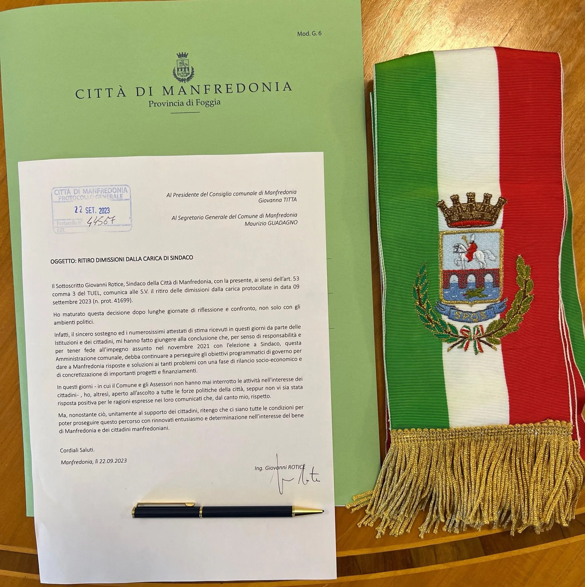 “Il Sottoscritto Giovanni Rotice, Sindaco della Città di Manfredonia, con la presente, ai sensi dell’art. 53 comma 3 del TUEL, comunica alle S.V. il ritiro delle dimissioni dalla carica protocollate in data 09 settembre 2023 (n. prot. 41699).