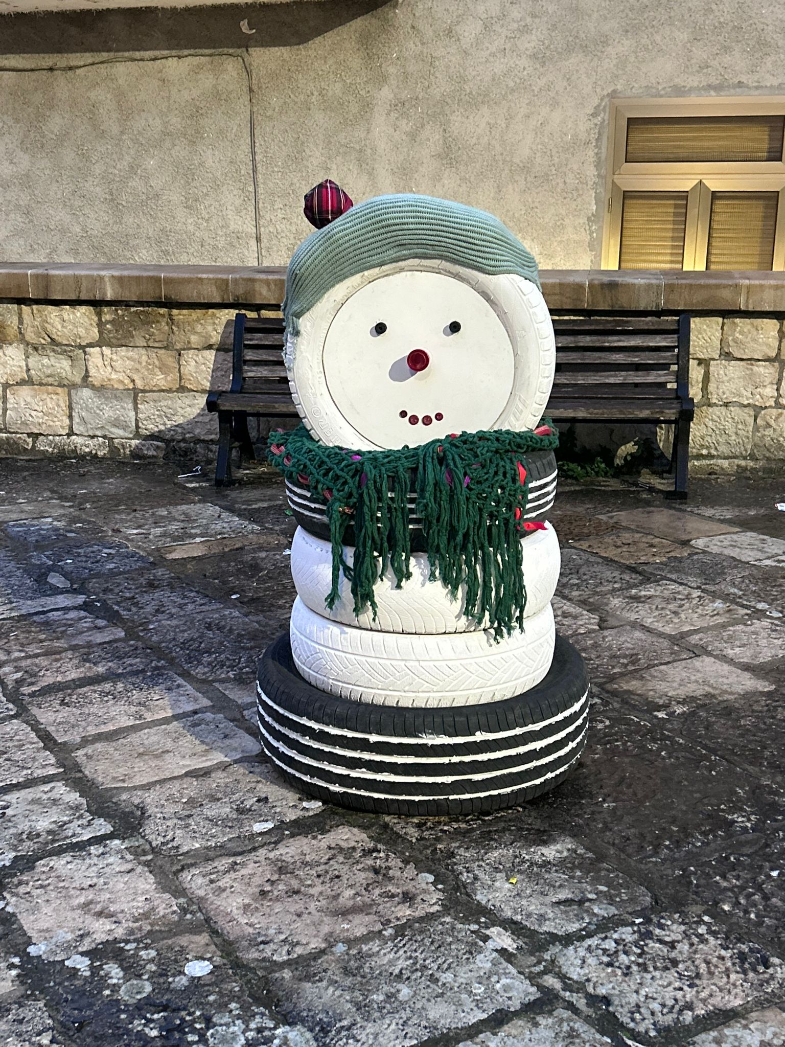 Babbi Natale, pupazzi di neve, ghirlande e figure natalizie realizzate con gomme riciclate oggi arricchiscono le strade del borgo, raccontando una storia che va oltre l’estetica. Dietro ogni decorazione c’è un messaggio chiaro: nulla è davvero inutile se accompagnato dall’immaginazione e dal rispetto per l’ambiente.