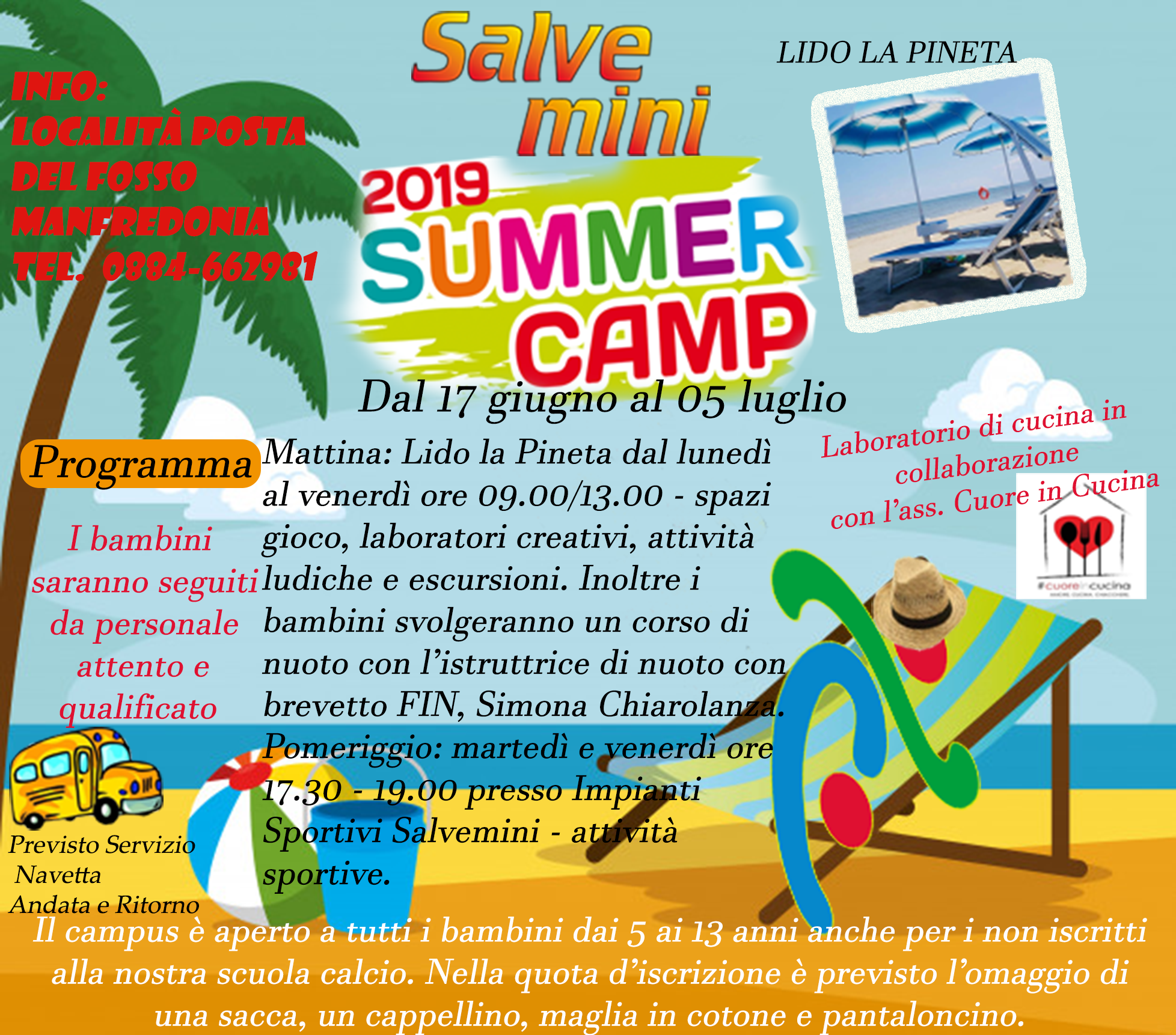SALVEMINI SUMMER CAMP 2019: Partecipa anche tu al campus estivo organizzato dalla Polisportiva Salvemini!!!Le attività del Campus Estivo sono ideate sulla base dei desideri dei vostri bambini, così puoi lavorare o rilassarti mentre tuo figlio fa quello che gli piace sotto l’occhio attento dei nostri bravi allenatori e assistenti. Inoltre i bambini seguiranno un corso di nuoto con l’istruttrice con brevetto(FIN) Simona Chiarolanza. Durata Campus:dal 17 giugno al 05 luglio 2019Età dei partecipanti: tutti i bambini, anche non iscritti alla nostra scuola calcio dai 5 ai 13 anniOrari: Mattina presso Lido la Pineta dal lunedì al venerdì dalle 09.00 alle 13 e pomeriggio presso gli Impianti Sportivi Salvemini, il martedì e venerdì dalle 17.30 alle 19.00.Apertura iscrizioni: 7 giugno 2019Le attività del Campus:Spazi gioco, percorsi motori, nuoto, laboratori creativi, escursioni e laboratori di cucina in collaborazione con l’Associazione Cuore in Cucina.PORTA ANCHE TU TUO FIGLIO A DIVERTIRSI CON NOI!!!!Nella quota di iscrizione è previsto l’omaggio di una sacca, un cappellino, una maglia in cotone e un pantaloncino.Per info e iscrizioni: Localitá Posta del Fosso-Manfredonia Tel.0884662981Area Comunicazione Salvemini