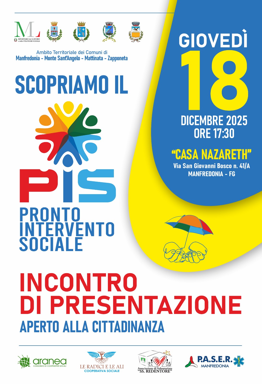L’Ambito Territoriale dei Comuni di Manfredonia, Monte Sant’Angelo, Mattinata e Zapponeta promuove un incontro pubblico di presentazione del PIS – Pronto Intervento Sociale, strumento operativo volto a garantire risposte tempestive e coordinate alle situazioni di emergenza sociale.