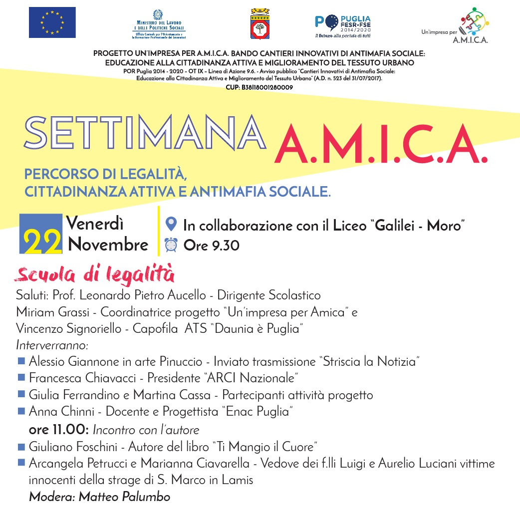 Venerdì 22 novembre (dalle ore 9.30), in collaborazione con il “Liceo Galileo – Moro” di Manfredonia, “Un’Impresa per A.M.I.C.A.”, con “Scuola di Legalità”, dà voce e spazio ai giovani del territorio partendo da ciò che loro stessi sono riusciti a realizzare nel primo anno di attività, dove spicca la simulazione realistica della creazione di un’impresa attraverso il bando “Resto al Sud”, che sarà illustrata nei dettagli da Giulia Ferrandino e Martina Cassa(in rappresentanza dei 30 ragazzi partecipanti alle attività di progetto) con il supporto di Anna Chinni(docente e progettista “Enac Puglia”).