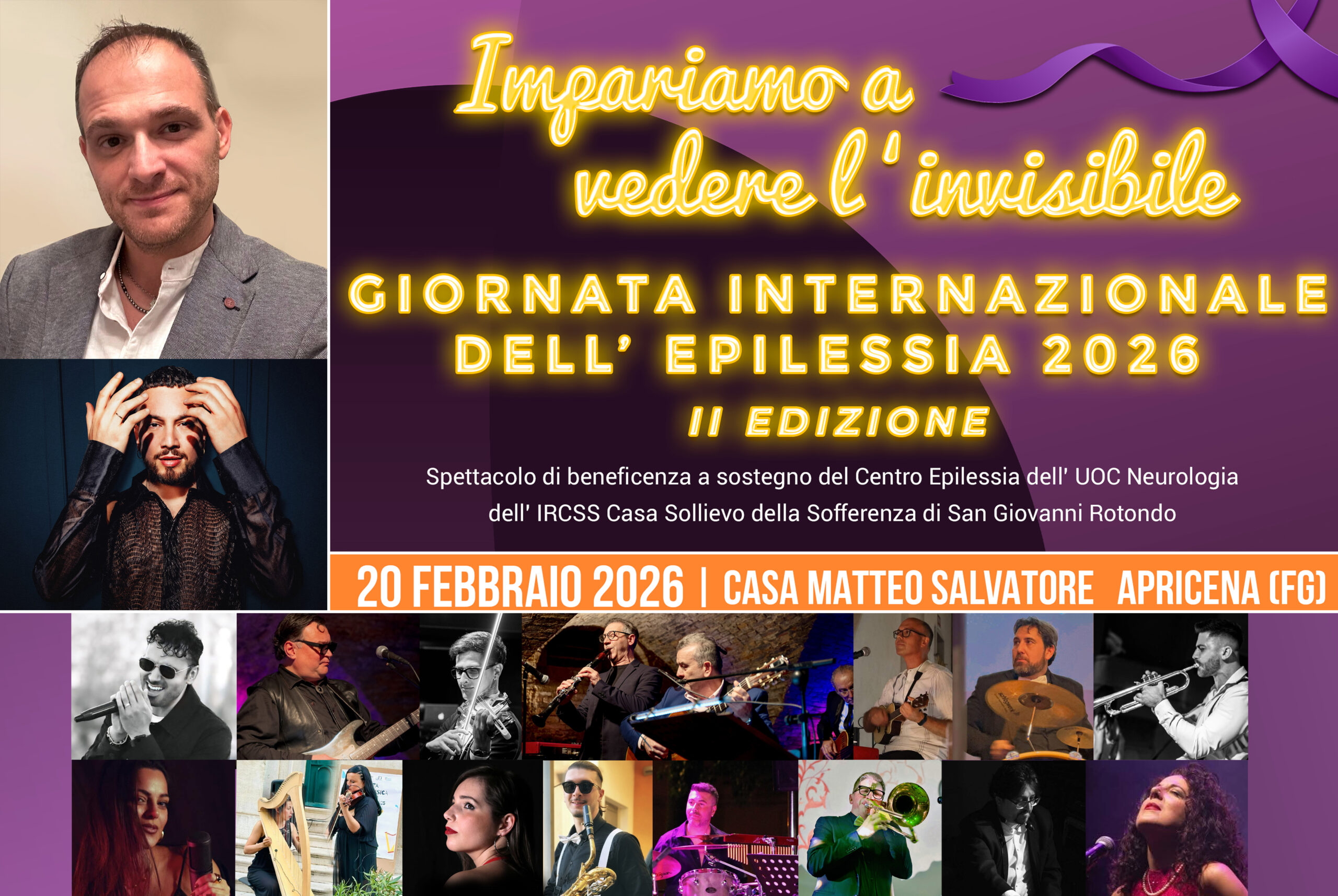 Dopo il grande successo della prima edizione tenutasi presso il Teatro “G. Verdi” di San Severo nel Febbraio 2025 l’ Associazione Armonie Daune Aps organizzerà la Seconda Giornata Internazionale dell’Epilessia, che si terrà venerdì 20 febbraio 2026 presso Casa Matteo Salvatore di Apricena (FG).