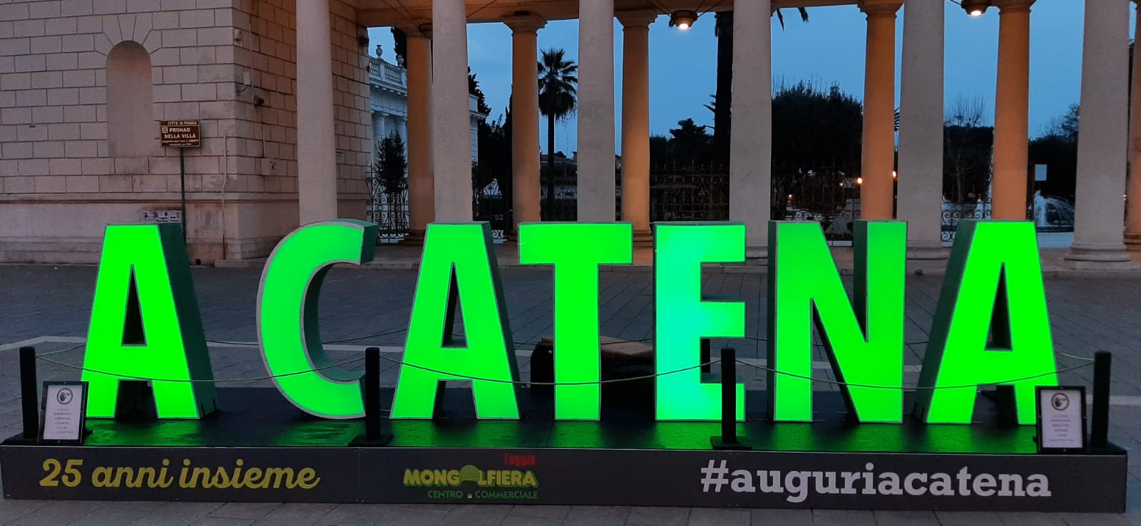 Una frase che è diventata una vera installazione, montata inizialmente in un luogo simbolo della città, Piazza Cavour, dinanzi al Pronao della Villa Comunalee ora spostata nel parcheggio del centro commerciale. Una postazione da cui chi vorrà potrà scattare un selfie o un video di auguri e postarlo sui social con l’hashtag #AuguriaCatena.