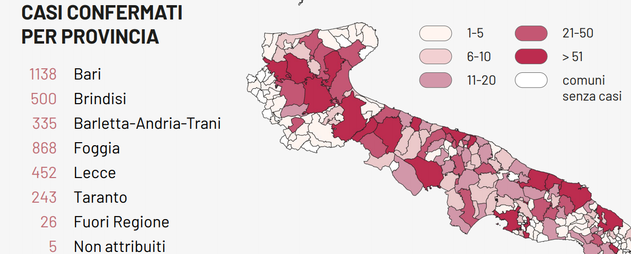 Il totale dei casi positivi Covid in Puglia è di 3.567 così divisi: