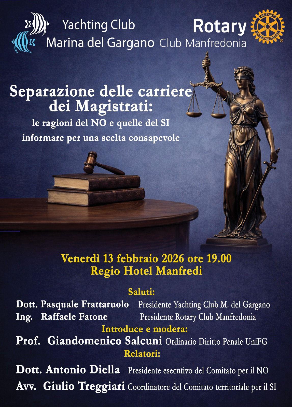 Manfredonia – Venerdì 13 febbraio 2026, alle ore 19.00, presso il Regio Hotel Manfredi, si terrà l’incontro pubblico dal titolo “Separazione delle carriere dei Magistrati: le ragioni del NO e quelle del SI informare per una scelta consapevole”, promosso congiuntamente dallo Yachting Club Marina del Gargano e dal Rotary Club Manfredonia.
