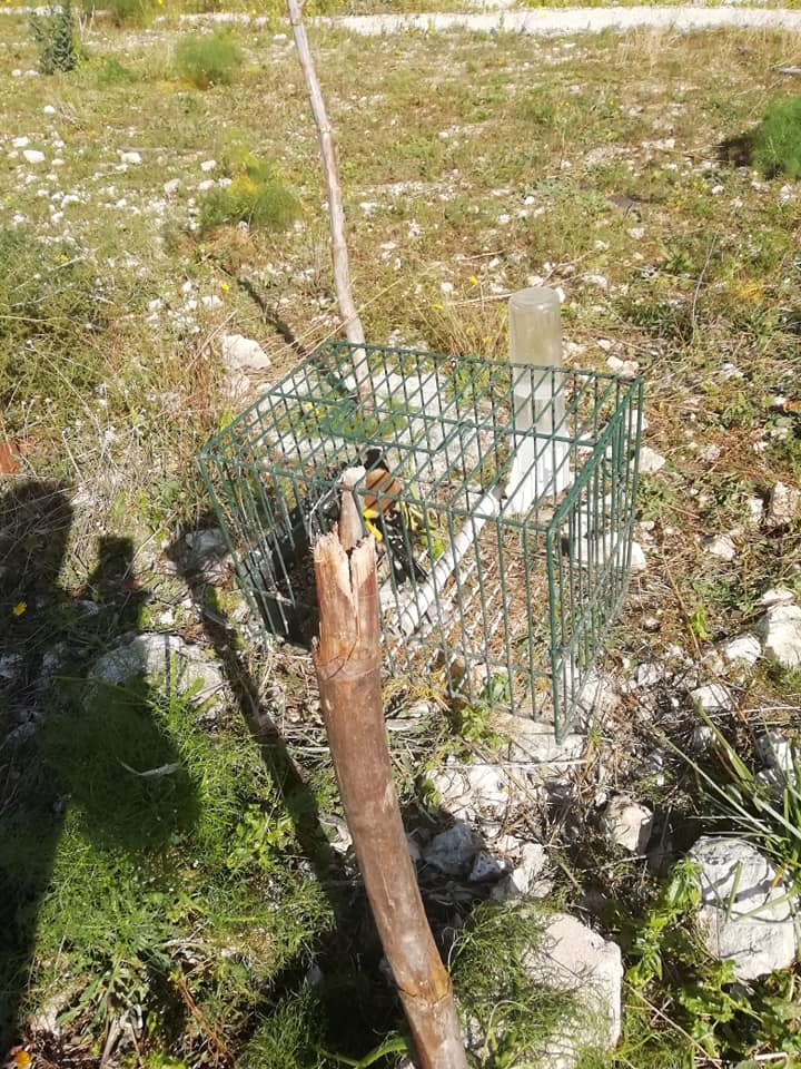 In un terreno in località nuovo palazzetto dello sport abbandonato sono stati rinvenuti  archetti trappola e cardellini in gabbia, che veniva utilizzato come richiamo vivo.