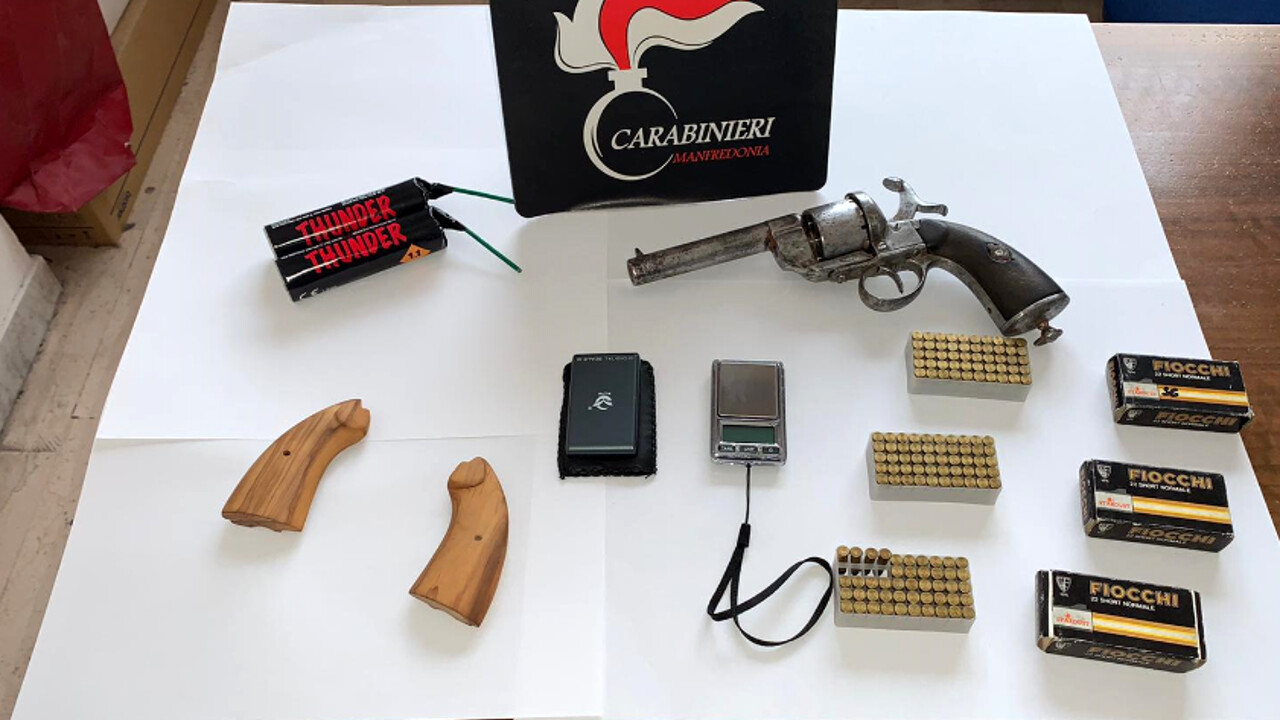 A finire in manette è stato un giovane del posto poiché, a seguito della perquisizione, è stato trovato in possesso, presso la sua abitazione, di una vecchia pistola revolver, ben occultata e perfettamente funzionante, circa 150 munizioni, due ordigni esplosivi e un bilancino di precisione.