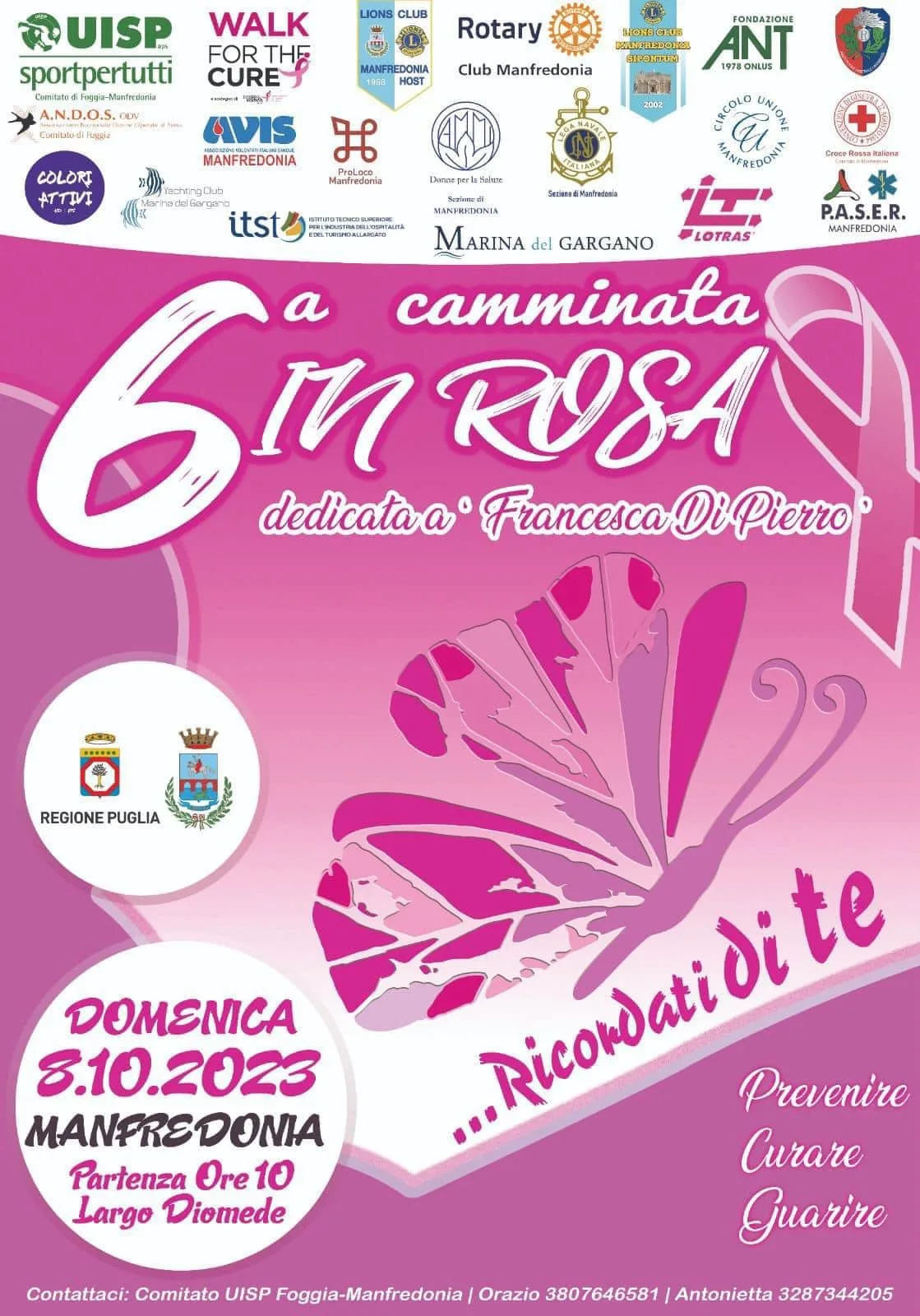 Le Camminate in Rosa del mese di Ottobre si terranno anche a Monte Sant’Angelo (15 ottobre), Mattinata (22 ottobre), Cerignola (28 ottobre), San Giovanni Rotondo (29 ottobre).