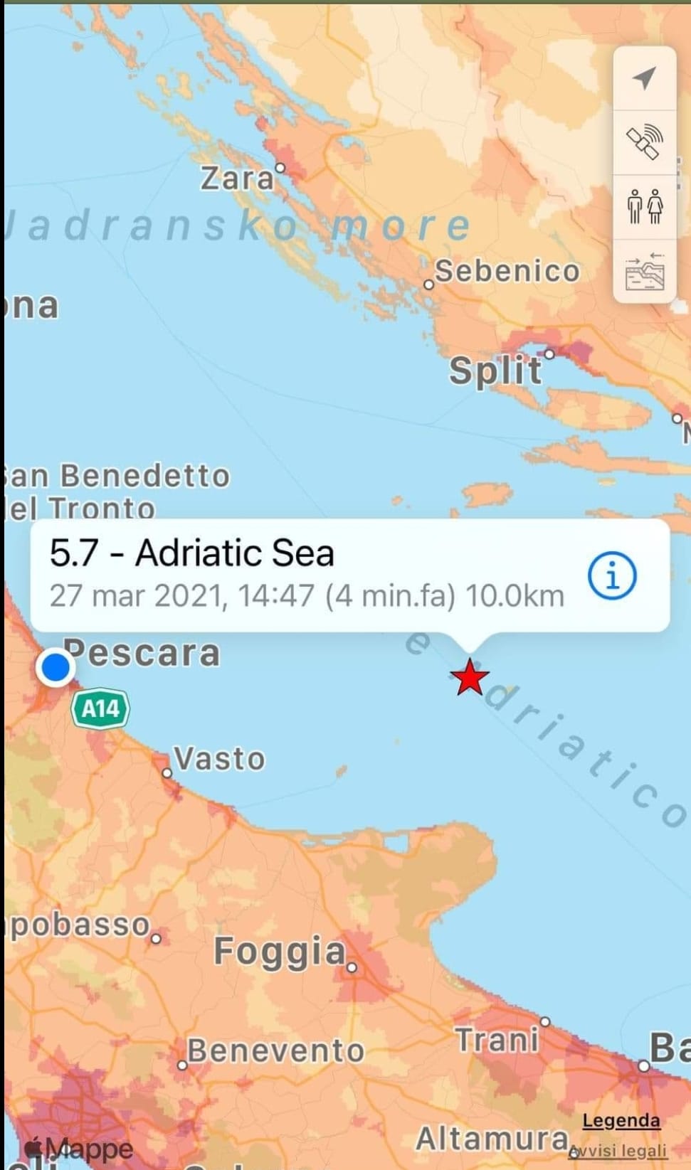 Una forte scossa di terremoto di magnitudo 5.6 è stata registrata nel mare adriatco, poco a nord del Promontorio del Gargano alle 14,57. L’epicentro in mare aperto a 10 chilometri di profondtà. Il sisma è stato avvertito distintamente in tutta la Capitanata e in Molise, particolarmente nei centri costieri del Gargano. Il terremoto è stato inoltre avvertito anche a Foggia. Alla prima forte scossa, ne sono seguite altre due: alle 15.00 di magnitudo 4.1 e alle 15,15 di magnitudo 3.4. Non si segnalano danni. Solo tanta paura.