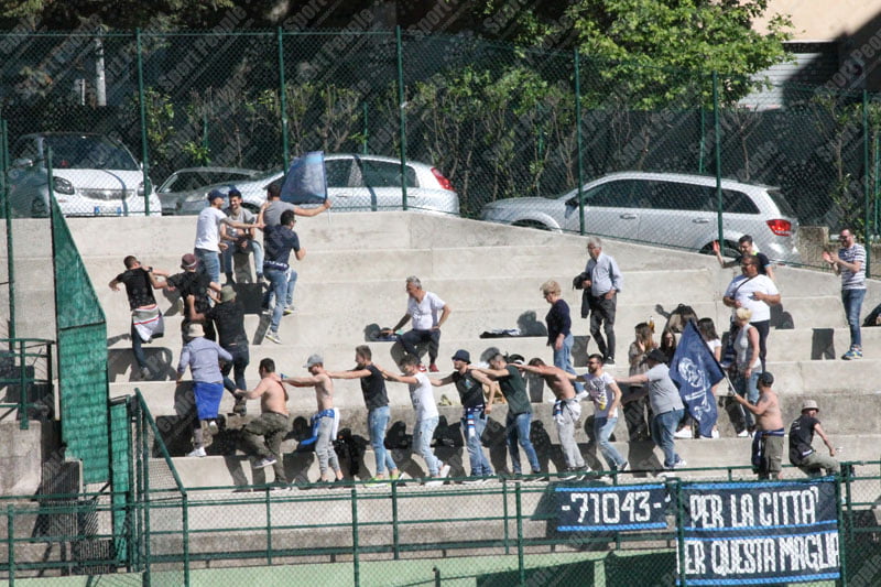 A festeggiare sono soprattutto gli ultras pugliesi presenti nel settore ospiti del “Bachelet”, riconducibili al gruppo che al “Miramare” occupa la “gradinata est” (informazioni più dettagliate sulla situazione del tifo nel capoluogo garganico si possono trarre dai due resoconti del Direttore riguardanti le sfide Manfredonia ˗ Bisceglie e Manfredonia ˗ Agropoli).