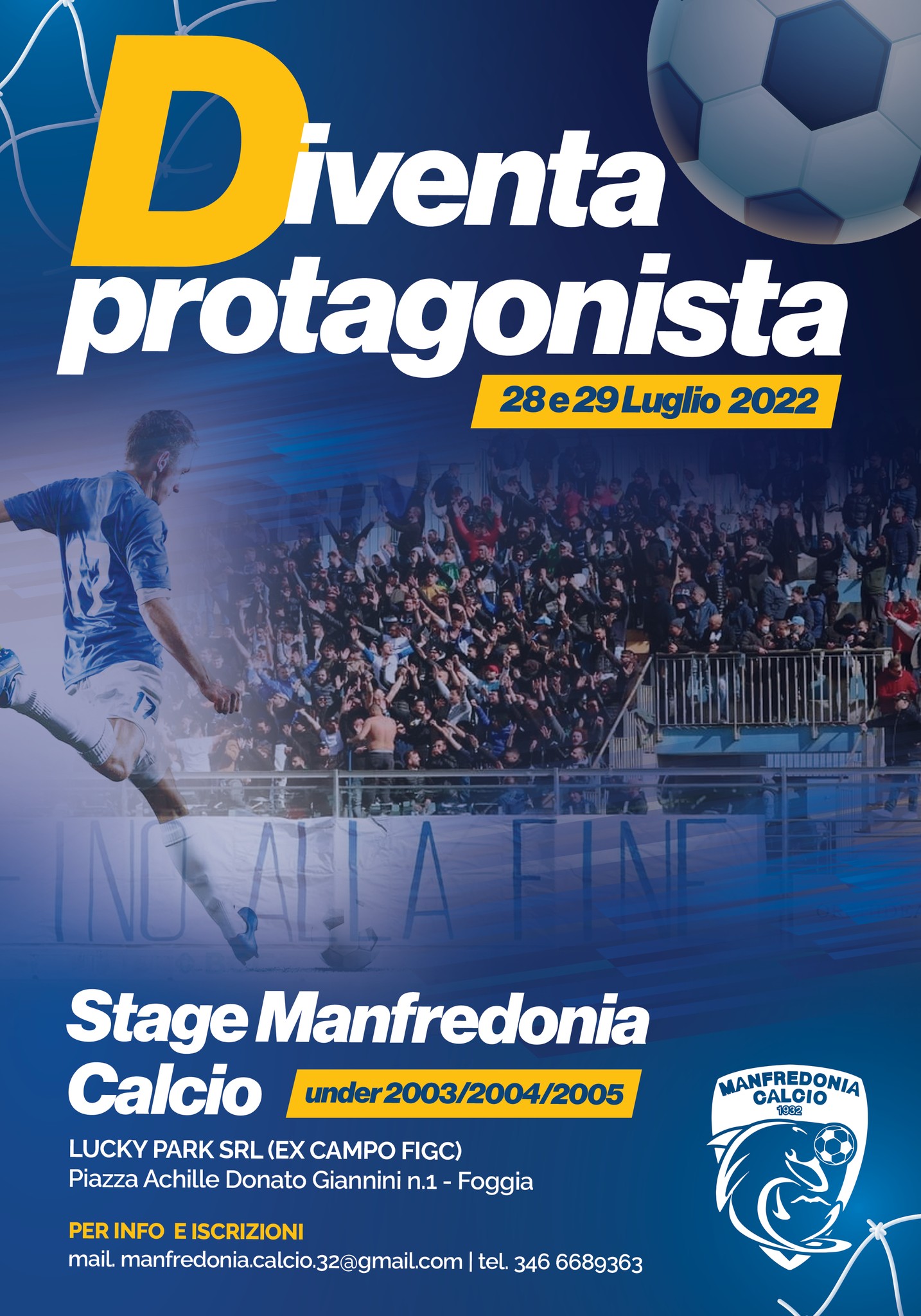 Per info e iscrizioni scrivere alla mail manfredonia.calcio.32@gmail.com o tel al 346 6689363