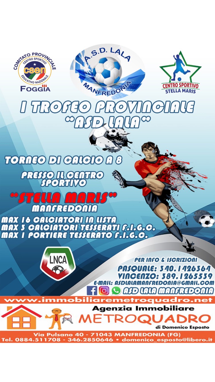Finalissima I Trofeo Provinciale “ASD LALA” Calcio a 8Finalissima tra il Minami di Matteo Stoppiello e la Cantine De Nittis/D’Alba di Raffaele De Nittis.Ore 21:30 presso il centro Sportivo Stella Maris (ingresso via della rucola).In diretta video su Facebook sulla pagina di ManfredoniaTv e ASD LALA Manfredonia.In diretta live (risultato) sull’app Tuttocampo.