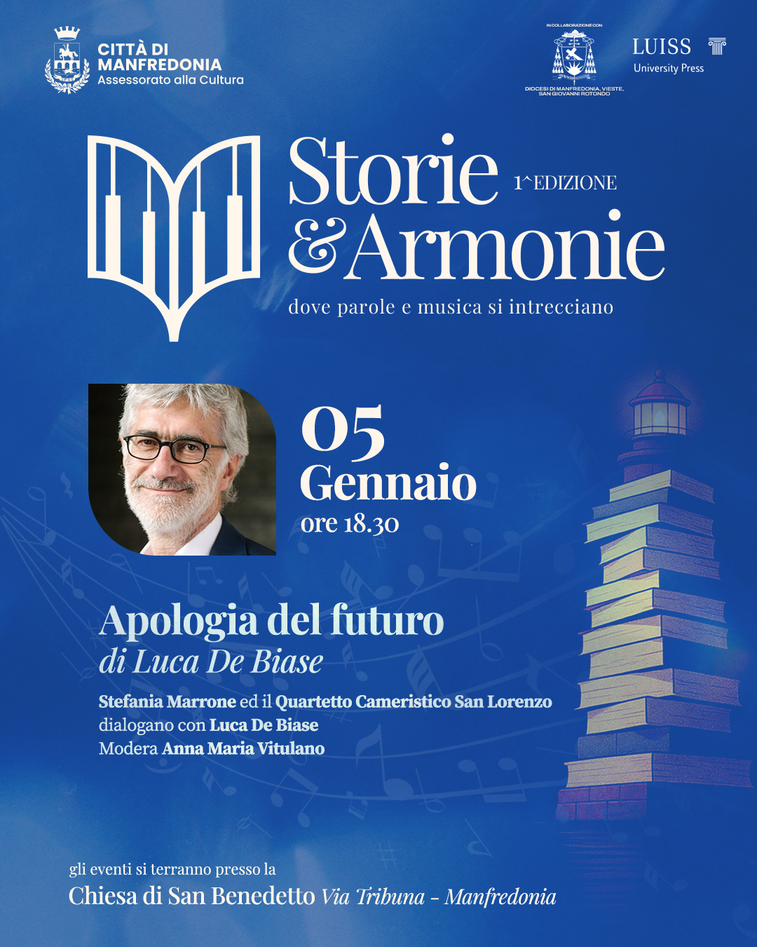 Si conclude con un nuovo incontro da non perdere la rassegna Storie & Armonie: lunedì 5 gennaio 2026, alle ore 18.30, la Chiesa di San Benedetto di Manfredonia ospiterà il terzo e ultimo appuntamento di questo viaggio tra parole, idee e musica. Protagonisti saranno Luca De Biase con il suo libro Apologia del futuro e Stefania Marrone di Bottega degli Apocrifi, per una riflessione appassionata sul tempo che viviamo e sul futuro che ci attende.