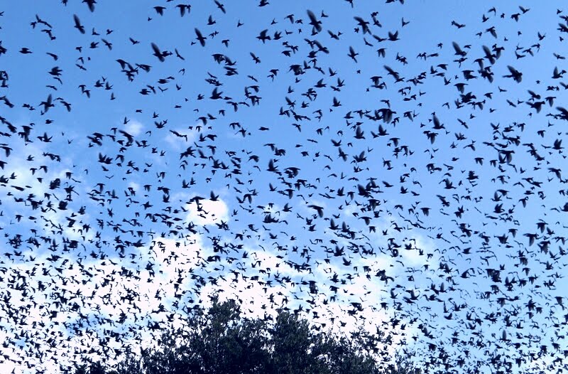 Manfredonia – NEI bianchi mattini, enormi nuvole di stormi, volano ammucchiati, in serie, centuplicati,di numeri matematici, o algebrici non quantificabili, tra la parte bassa dei raggi del sole, arrivano dal Tavoliere, rumoreggiano tra il cielo pesante e vecchi fili spinati, con patina di stagno, tra boati di piombo, un forte senso assordante di vuoto. Volano neri, su milioni di persone, come ceri bruciacchiati, tra gli ulivi dal buon odore forte, fucilate e cani sciolti che, inseguono immense ombre flessibili.