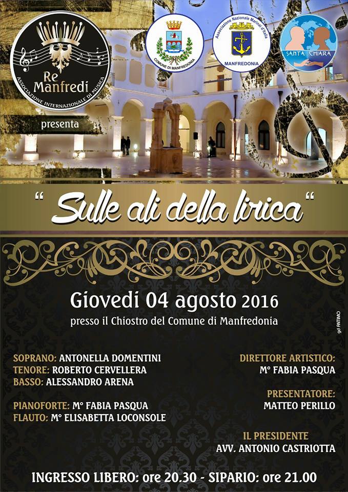 ha organizzato, un concerto lirico all’interno del chiostro del Comune di Manfredonia, intitolato “Sulle ali della lirica” che verrà esibito il giorno 04 agosto alle ore 21, con ingresso libero, nella suggestive location di Palazzo San Domenico, tra le braccia deglia archi settecenteschi.