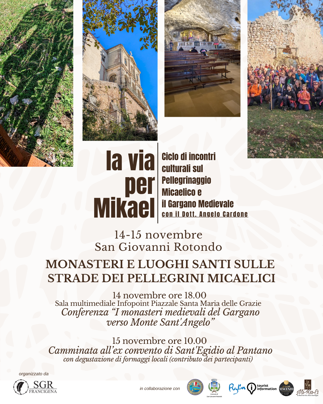L’Associazione SGR Francigena presenta il secondo appuntamento del ciclo di incontri culturali “Il Pellegrinaggio micaelico e il Gargano Medievale”. L’evento, intitolato “Monasteri e luoghi santi sulle strade dei pellegrini micaelici”, si terrà il 14 e 15 novembre a San Giovanni Rotondo.