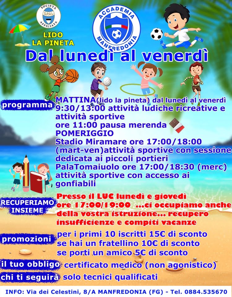 Eccoci qui …come promesso anche quest’anno ci sarà il  Summer camp della scuola calcio Accademia Manfredonia .
