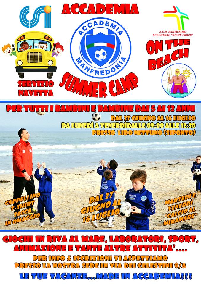 L’Accademia Manfredonia in collaborazione con il CSI e Lido Nettuno organizza il secondo SUMMER CAMP aperto a tutti i bambini e bambine dai 5 ai 12 anni.Quest’anno le attività si svolgeranno sia presso lo Stadio Comunale “Miramare”, che presso il Lido Nettuno (Siponto), dove sarà possibile usufruire del Servizio NAVETTA . Il SUMMER CAMP avrà inizio il 27 Giugno e terminerà il 16 Luglio, dal lunedì al venerdì dalle ore 9:00 alle 12:30, mentre il martedì e il venerdì ci saranno anche le attività pomeridiane presso lo stadio “Miramare” dalle ore 17.00 alle 18.15(.solo per il 28/6 e il 1/7 dalle ore 16.00 alle 17.00). Il programma della mattina prevede giochi in riva al mare, laboratori, animazione e sport, mentre per le attività pomeridiana ci saranno attività di scuola calcio e mini-tornei.Tutte le attività saranno dirette dallo Staff Tecnico Accademico. Tutti i partecipanti avranno in omaggio una t-shirt, un cappellino ed una simpatica sacca. Per info ed iscrizioni potete rivolgervi presso la segreteria in Via dei Celestini 8/A dalle 10.00 alle 12.30 e dalle 17.00 alle 20.00 entro sabato 25 Giugno.