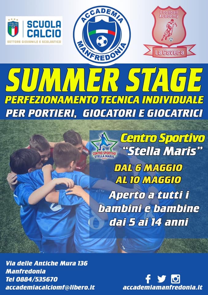 L’Accademia ha il piacere di comunicare che, dal 6 al 10 maggio 2019 presso il nuovissimo centro sportivo sipontino Stella Maris, svolgerà uno stage in collaborazione con L’Academy La Cavera. Questa nuova iniziativa sarà  aperta a tutti i ragazzi tesserati alle varie società di calcio ma anche a ragazzi che amano scoprire il mondo del calcio senza essere tesserati.
