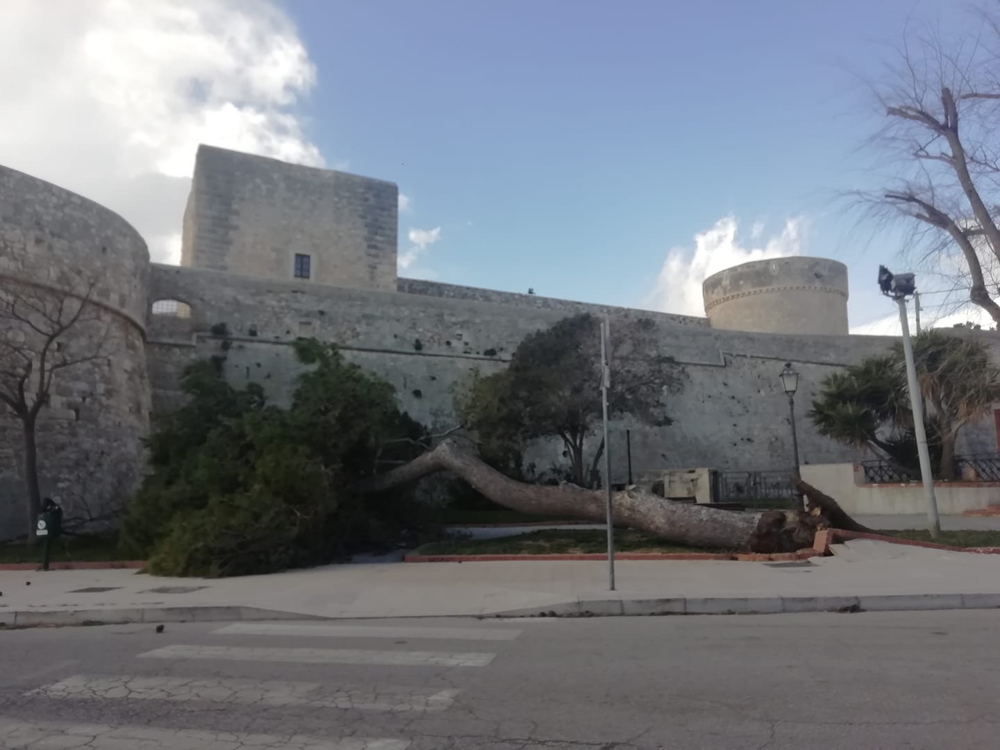 “Sono 200 gli alberi che hanno subito danni”, ha riferito Matteo Perillo, presidente dell’associazione di protezione civile P.A.S.E.R. Manfredonia, che nelle ore in cui raccomandava alla popolazione di rintanarsi in casa per il pericolo incombente dovuto al forte vento, insieme ai suoi volontari percorreva le strade della città per controlli e aiuti. “Molti di questi si sono abbattuti rovinosamente al suolo, mentre altri hanno perso rami anche molto pesanti che cadendo hanno provocato diversi danni”. Un enorme pino si è abbattuto dinanzi la scuola elementare San Giovanni Bosco, dove per poco è stata evitata una tragedia: soltanto mezz’ora prima era suonata la campanella dell’uscita ed i piccoli alunni avevano appena lasciato l’istituto.
