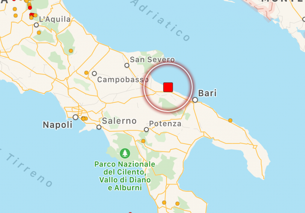 Una forte scossa di terremoto ha colpito la Puglia pochi minuti fa. Secondo i primi dati, la scossa s’è verificata alle 10:13 di stamattina e ha colpito la zona di Barletta. La scossa, di magnitudo 3.9 a 34.2km di profondità, è stata avvertita in tutta la Regione e in modo particolare a Barletta, Andria, Trani, Cerignola, Bisceglie, Corato, Molfetta. La scossa è stata avvertita persino a Bari e Foggia e in Basilicata, fino a Potenza. Numerose segnalazioni di risentimento sismico arrivano persino dall’Albania. Scuole evacuate a Barletta e gente in fuga dalle case. Centinaia di chiamate ai Vigili del Fuoco, ma al momento non si segnalano danni.