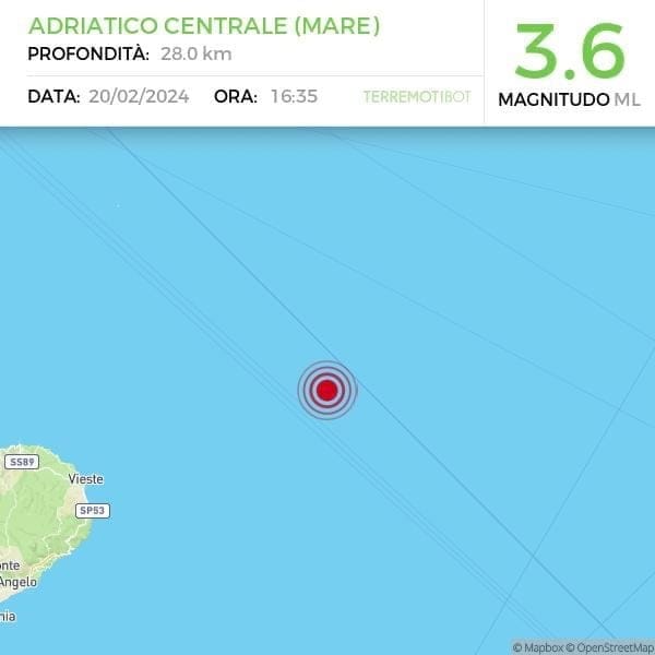 Un terremoto di magnitudo ML 3.6 è avvenuto al largo del Gargano alle ore 16.35, con coordinate geografiche (lat, lon) 42.048016.7870 ad una profondità di 28 km.