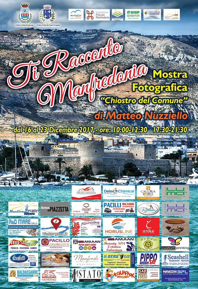 Mostra Fotografica “Ti Racconto Manfredonia” dal 16 al 23 Dicembre presso il chiostro del Comune tutti i giorni dalle 10.30/12.30 e 17.30/21.30 …La sua passione nasce dall’amore verso Manfredonia e per la foto aerea, in cui la si puo’ apprezzare in tutta la sua bellezza.