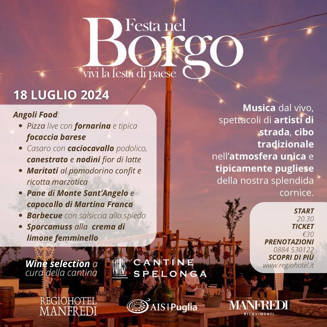 Anche questa volta, nella nuovissima Piazza del Borgo, troverai 6 angoli di degustazione di prodotti tipici locali e 4 angoli di degustazione vini. Ad esaltare questa esperienza, avremo ancora i sommelier dell’Associazione Italiana Sommelier Puglia – Foggia, che argomenteranno i vini di cantine Spelonga (e a tal proposito, ci sarà una splendida sorpresa!).