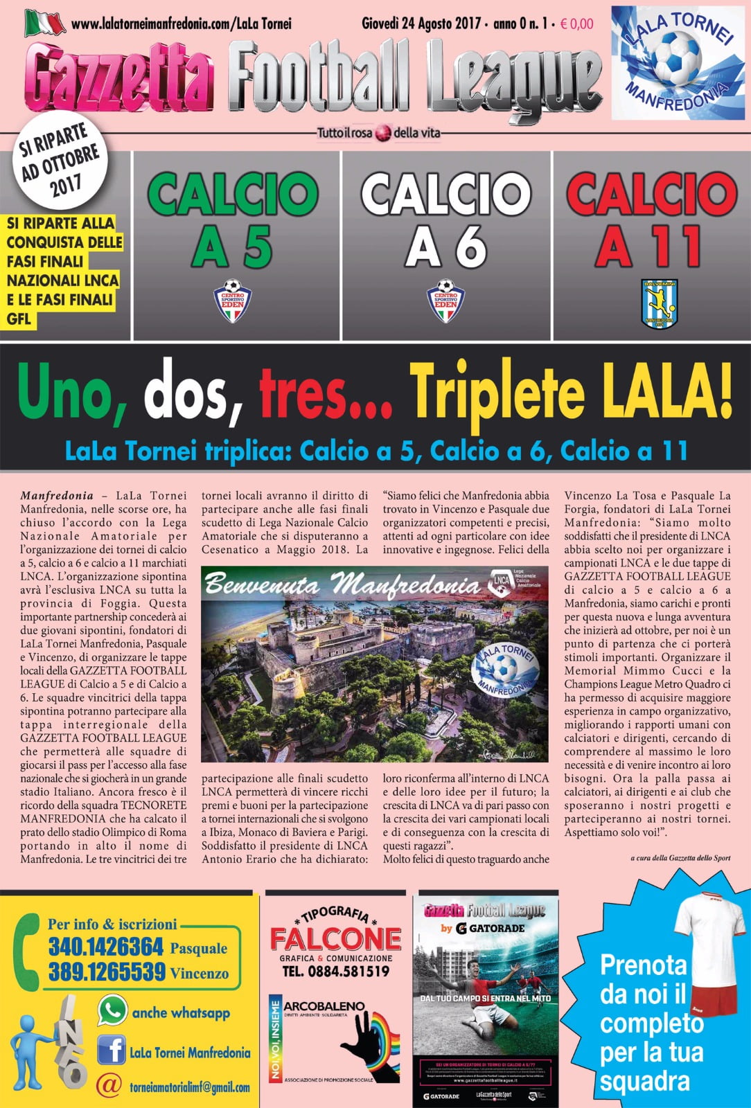 Molto felici di questo traguardo anche Vincenzo La Tosa e Pasquale La Forgia, fondatori di LaLa Tornei Manfredonia: “Siamo molto soddisfatti che il presidente di LNCA abbia scelto noi per organizzare i campionati LNCA e le due tappe di GAZZETTA FOOTBALL LEAGUE di calcio a 5 e calcio a 6 a Manfredonia, siamo carichi e pronti per questa nuova e lunga avventura che inizierà ad ottobre, per noi è un punto di partenza che ci porterà stimoli importanti. Organizzare il Memorial Mimmo Cucci e la Champions League Metro Quadro ci ha permesso di acquisire maggiore esperienza in campo organizzativo, migliorando i rapporti umani con calciatori e dirigenti, cercando di comprendere al massimo le loro necessità e di venire incontro ai loro bisogni. Ora la palla passa ai calciatori, ai dirigenti e ai club che sposeranno i nostri progetti e parteciperanno ai nostri tornei. Aspettiamo solo voi!”.