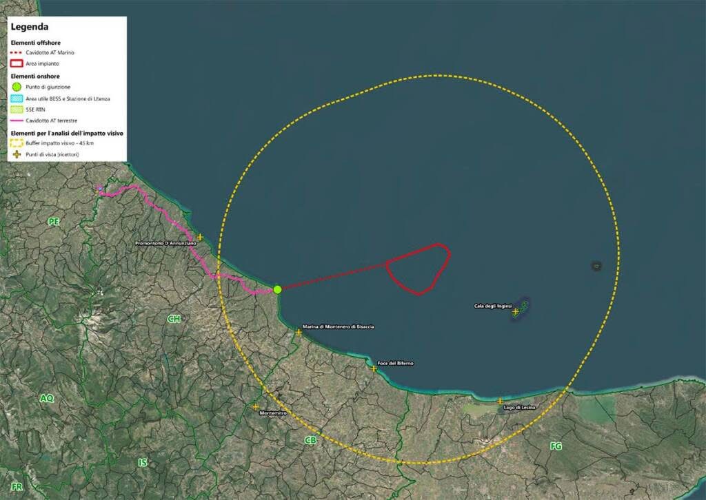 Quello in cantiere è un progetto da 3,7 miliardi di euro, per 67 torri da 15 MW ciascuna con una potenza complessiva di 1005 MW. Gli aerogeneratori verrebbero posizionati su fondazioni fisse al fondo marino e avrebbero un’altezza massima di 270 metri. La distanza minima dalla costa sarebbe di 21,5 km da quella molisana e forse anche meno dalle Tremiti (dalle notizie trapelate non ci sono dettagli in merito). Un cavodotto collegherebbe l’impianto a mare con la terraferma all’altezza del promontorio di Punta Penna a Vasto, proseguendo poi fino in Val Pescara dove sarebbe realizzato anche un sistema di accumulo dell’energia Bess da 350 MW, con 490 container (localizzato all’altezza della dell’allacciamento tra A25 e A14). Nel cerchio rosso della foto l’area dove è prevista la realizzazione dell’impianto.