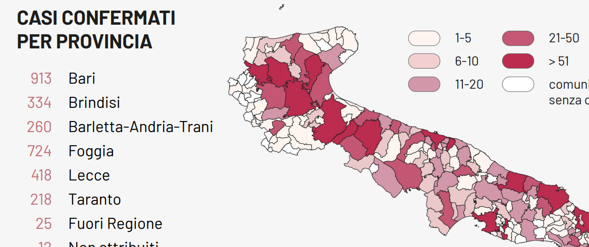 Il totale dei casi positivi Covid in Puglia è di 2.904 così divisi: