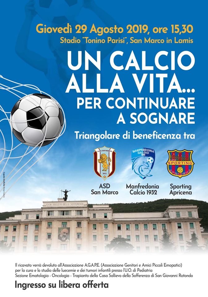 Giovedì 29 agosto, dalle ore 15.30 presso lo Stadio “Tonino Parisi” di San Marco in Lamis, Triangolare di beneficenza tra i padroni di casa dell’Asd Marco, il Manfredonia Calcio 1932 e lo Sporting Apricena.