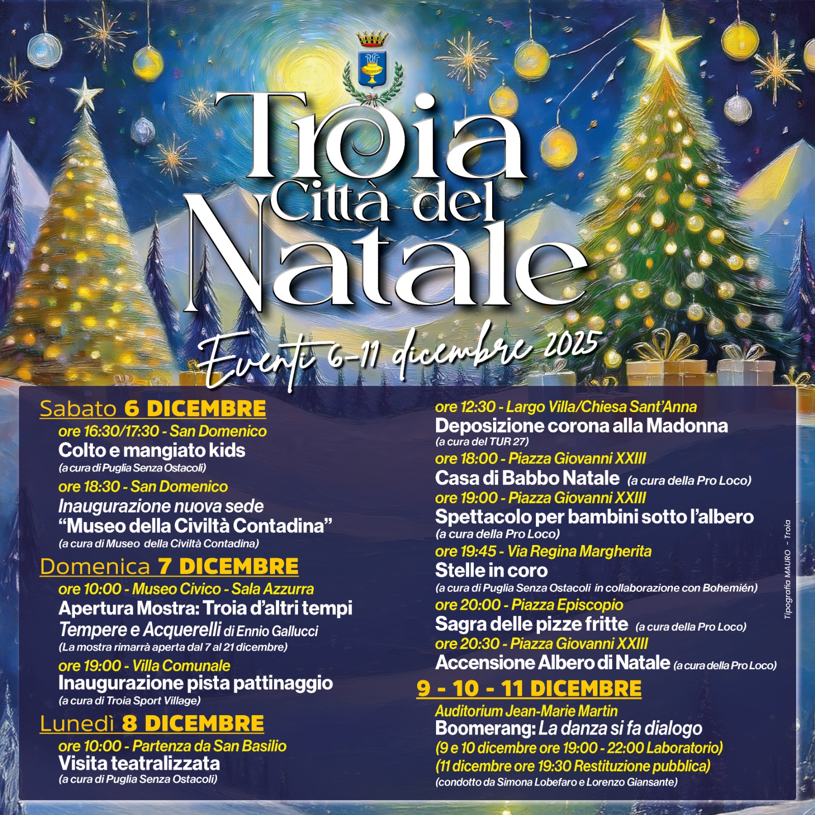 Il cartellone natalizio troiano 2025 – seguito da vicino dal consigliere comunale delegato alle Attività produttive, Antonio Cibelli – annovera nella prima parte del suo programma così come per diversi altri eventi che andranno in scena fino alla fine delle festività di Natale la partecipazione di diverse associazioni in prima linea nell’organizzazione: Puglia Senza Ostacoli, Museo della Civiltà Contadina, Troia Sport Village, Tur-27, Pro Loco, associazione Bohemién.
