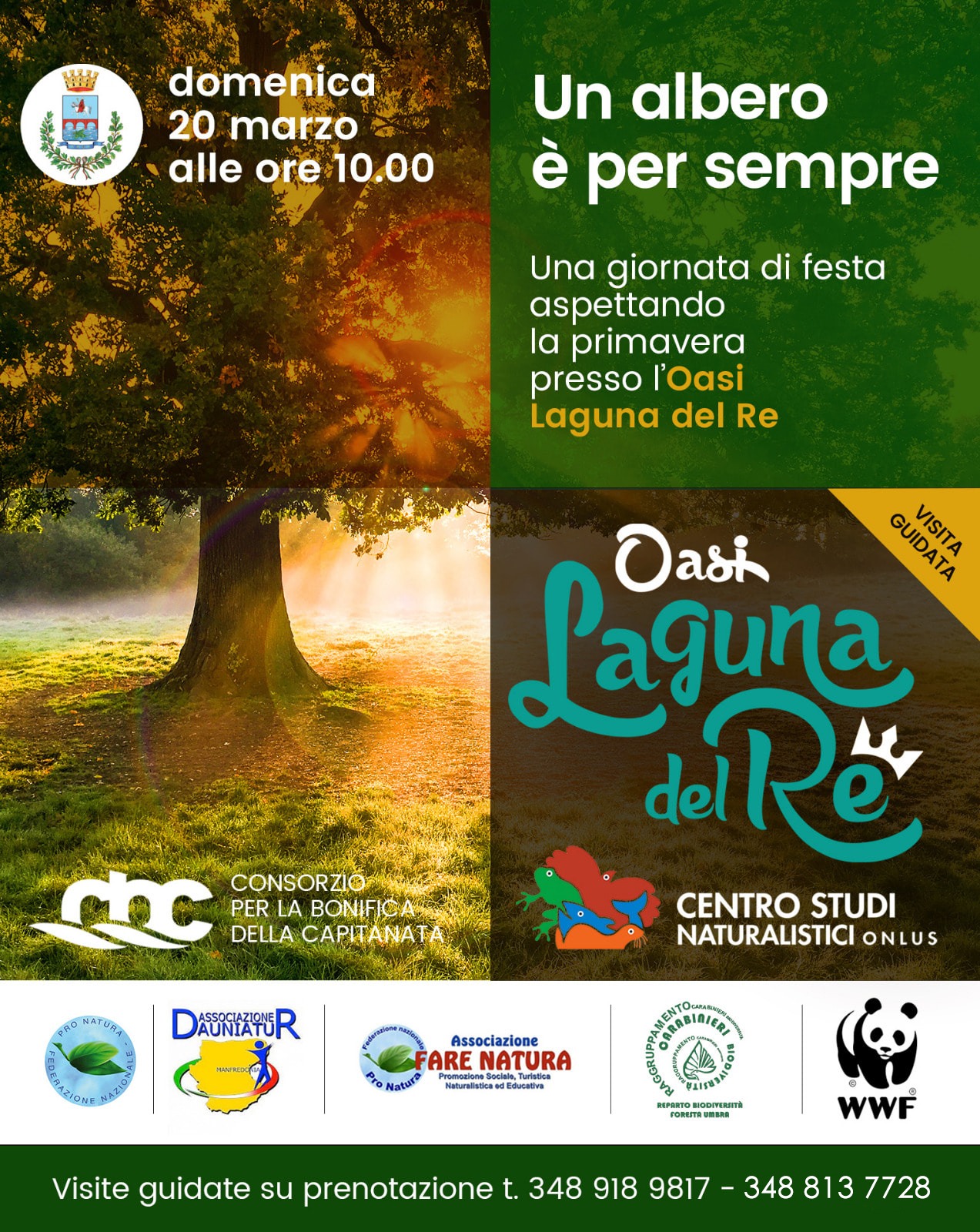 Domenica 20 marzo 2022, presso l’Oasi Laguna del Re (Manfredonia), di proprietà del Consorzio per la Bonifica della Capitanata, le associazioni Centro Studi Naturalistici Onlus, Fare Natura, Pro Natura, Daunia Tur, WWF Foggia, con il patrocinio del Comune di Manfredonia, nell’ambito del progetto “Un albero per il futuro” promosso dall’Arma dei Carabinieri – Raggruppamento Carabinieri Biodiversità, verranno piantati dei piccoli alberi.
