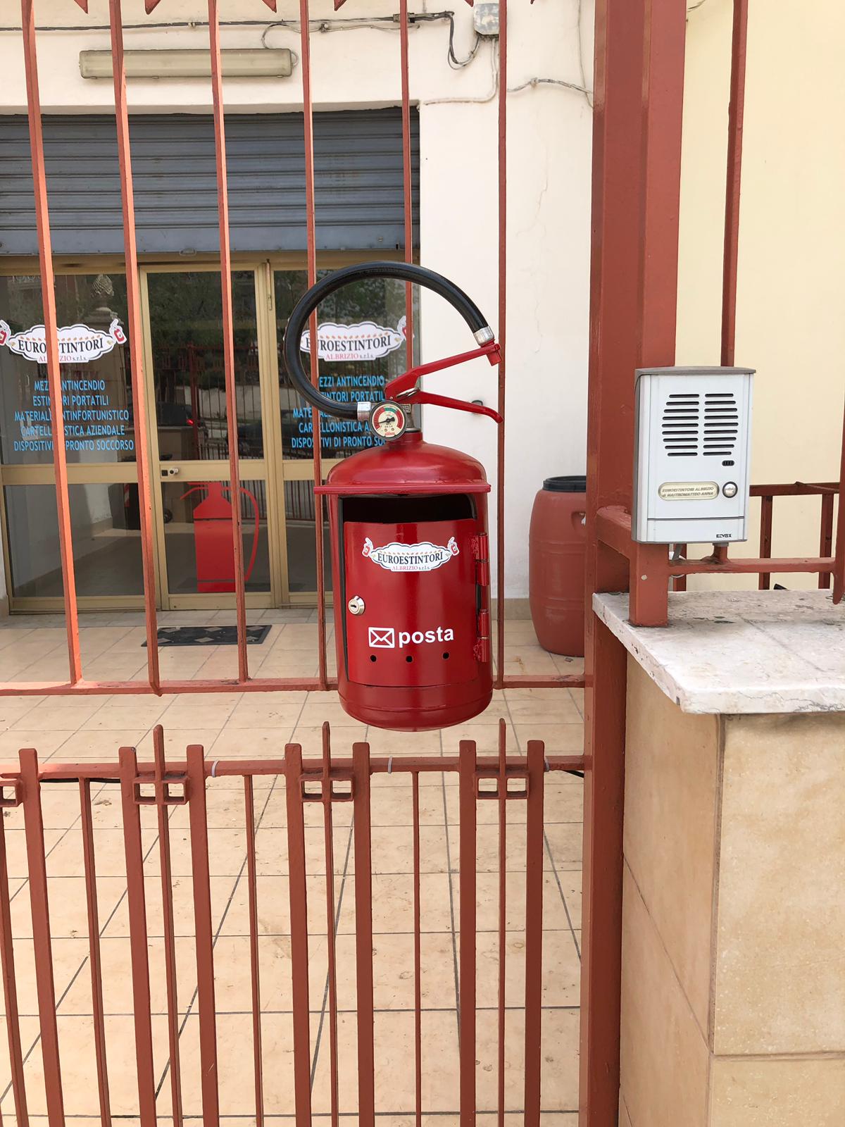 Alla sede della Euroestintori Albrizio S.r.l.s. a Manfredonia, un estintore usato diventa una simpatica e fantasiosa cassetta postale. Un ottimo sistema per sensibilizzare la gente a ”riciclare” qualcosa che non sarebbe stato più utile.
