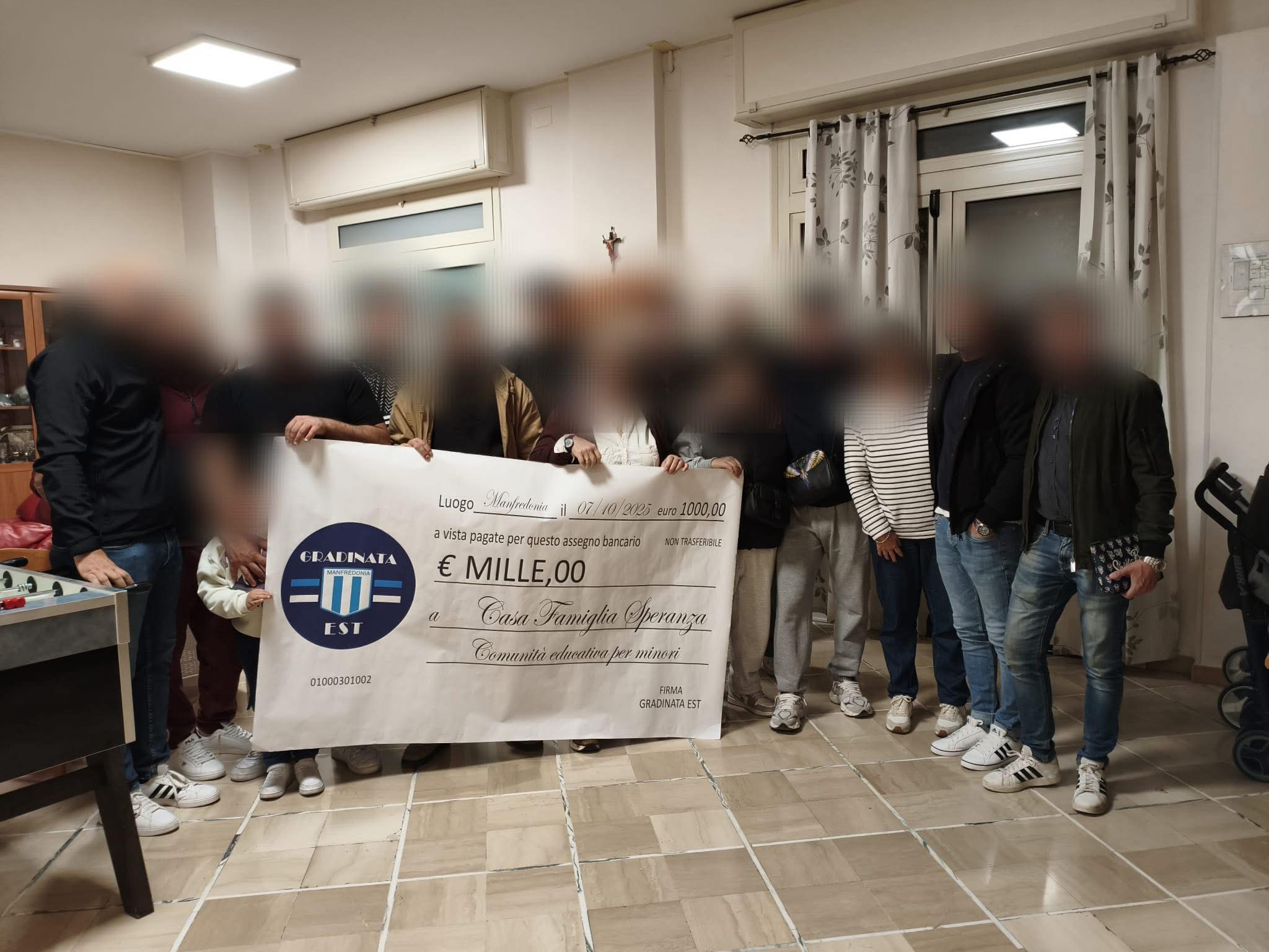 MANFREDONIA – Nel tardo pomeriggio di oggi una delegazione della Gradinata Est ha fatto visita alla Casa Famiglia Speranza per consegnare un contributo economico, frutto del ricavato della manifestazione “Gradinata Est in Fest” svoltasi lo scorso luglio. Un incontro semplice ma carico di significato, che ancora una volta testimonia l’impegno costante del gruppo nel sostenere iniziative di carattere sociale e solidale sul territorio.