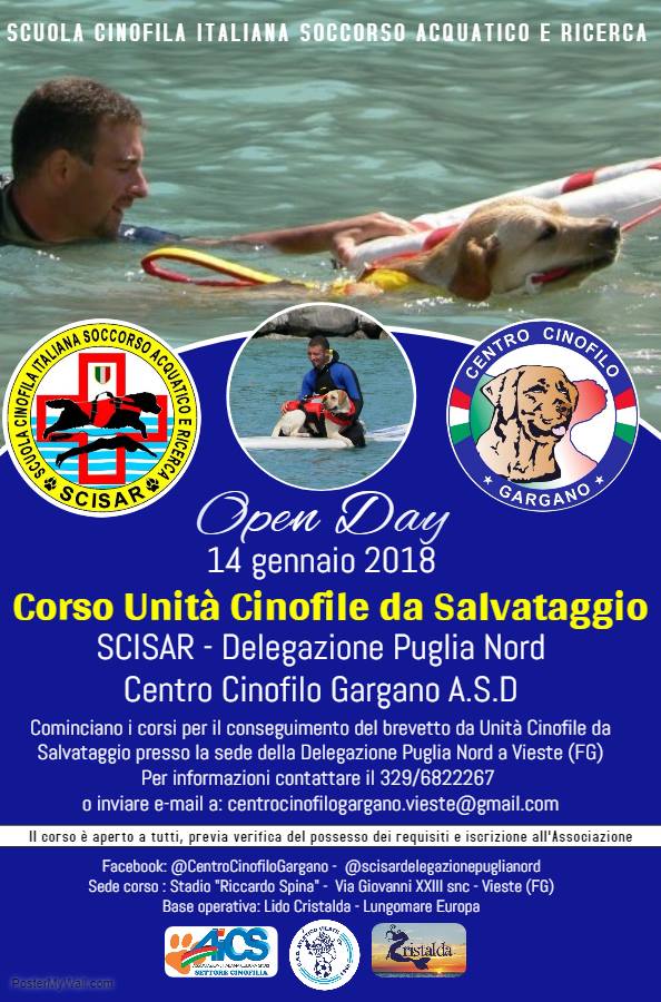La delegazione Puglia Nord della SCISAR – Scuola Cinofila Italiana Soccorso Acquatico e Ricerca – organizzazione operativa su tutto il territorio nazionale, terrà una riunione informativa presso la sede dello Stadio “Riccardo Spina” di Vieste al fine di presentare il corso per il conseguimento del brevetto operativo di Unità Cinofila di Salvataggio,che ufficialmente patirà dalla domenica successiva.