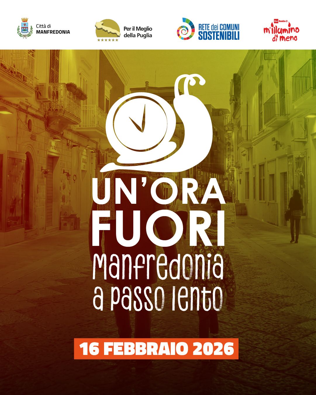 Il Comune di Manfredonia aderisce alla Giornata nazionale del risparmio energetico e degli stili di vita sostenibili “M’Illumino di Meno” promuovendo, per lunedì 16 febbraio, l’iniziativa “Un’ora fuori: Manfredonia a passo lento”, un invito rivolto a tutta la comunità a compiere un gesto semplice ma profondamente significativo: spegnere le luci non necessarie, lasciare l’auto, uscire a piedi e vivere lo spazio pubblico con maggiore consapevolezza.