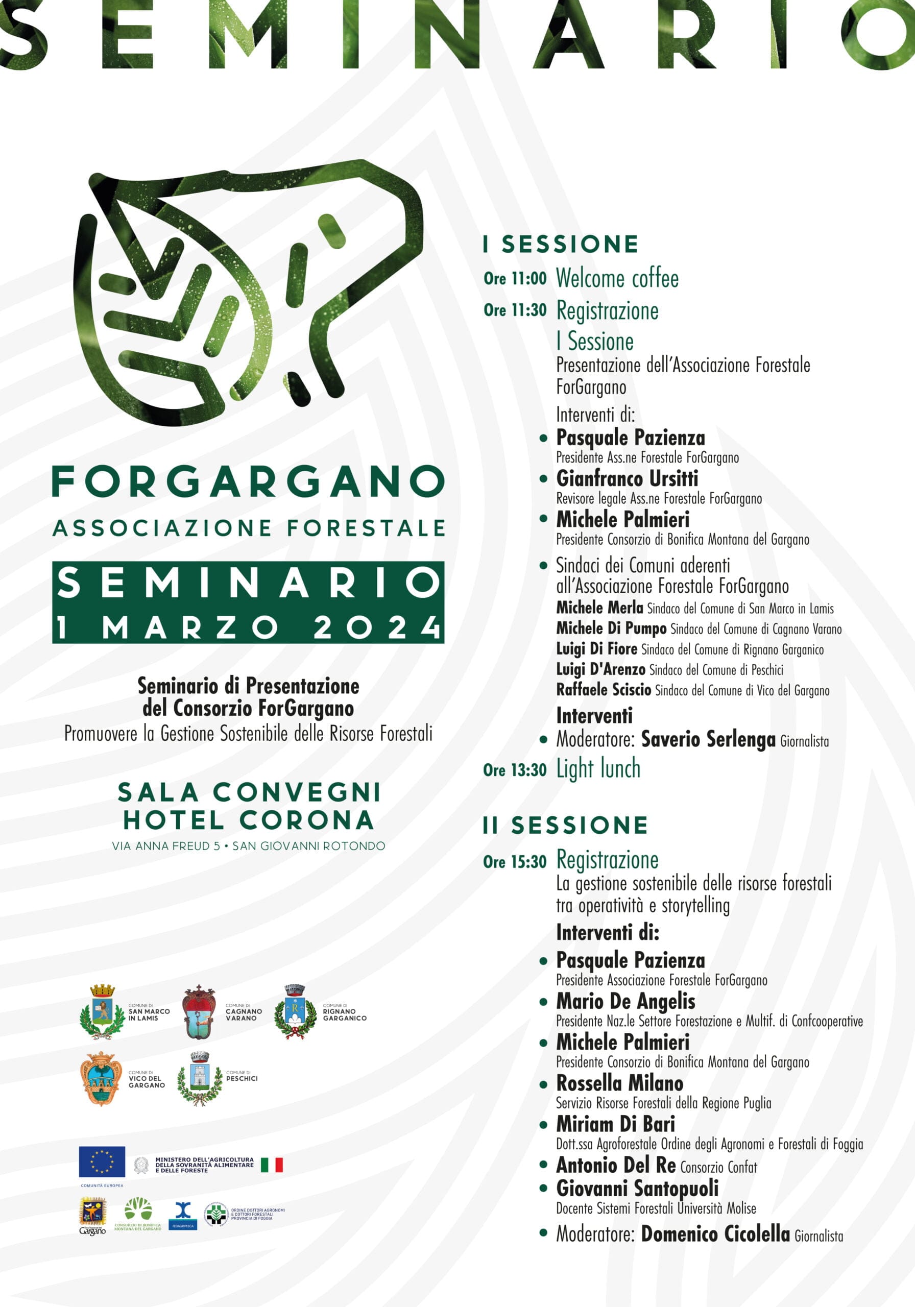 Il Seminario inizierà alle ore 11.00 con la prima sessione dedicata alla presentazione dell’Associazione Forestale. Interverranno: Pasquale Pazienza, (Presidente dell’Ente Parco nazionale del Gargano), Gianfranco Ursitti (Revisore Legale dell’Associazione ForGargano), Michele Palmieri (Presidente del Consorzio di Bonifica Montana del Gargano) e i Sindaci dei Comuni che hanno già aderito all’Associazione.