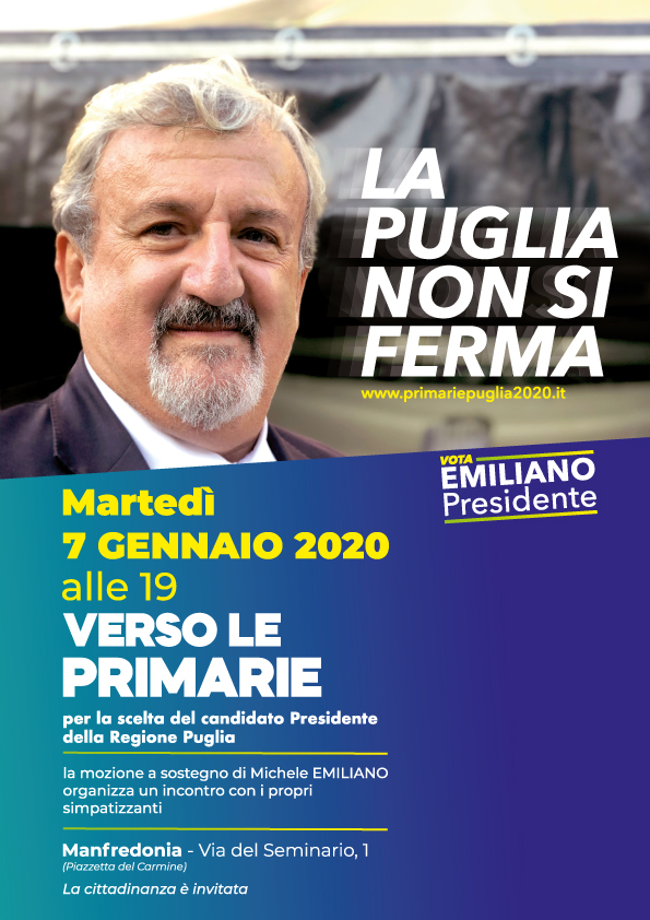 In vista delle Primarie del centrosinistra per la scelta del candidato Presidente della Regione Puglia che si terranno Domenica 12 Gennaio, la mozione a sostegno di Michele Emiliano organizza un incontro con i propri simpatizzanti MARTEDÌ 7 GENNAIO alle ore 19.00 presso la sede del Partito Democratico in Via del Seminario 1 (Piazzetta del Carmine).