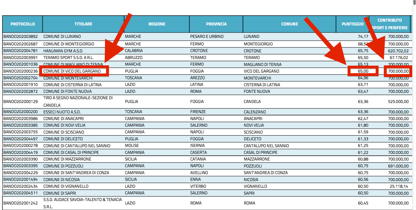 La Presidenza del Consiglio dei Ministri, Dipartimento dello Sport, ha pubblicato la graduatoria nazionale definitiva dei progetti presentati dalle amministrazioni comunali per cui è stato approvato il finanziamento.