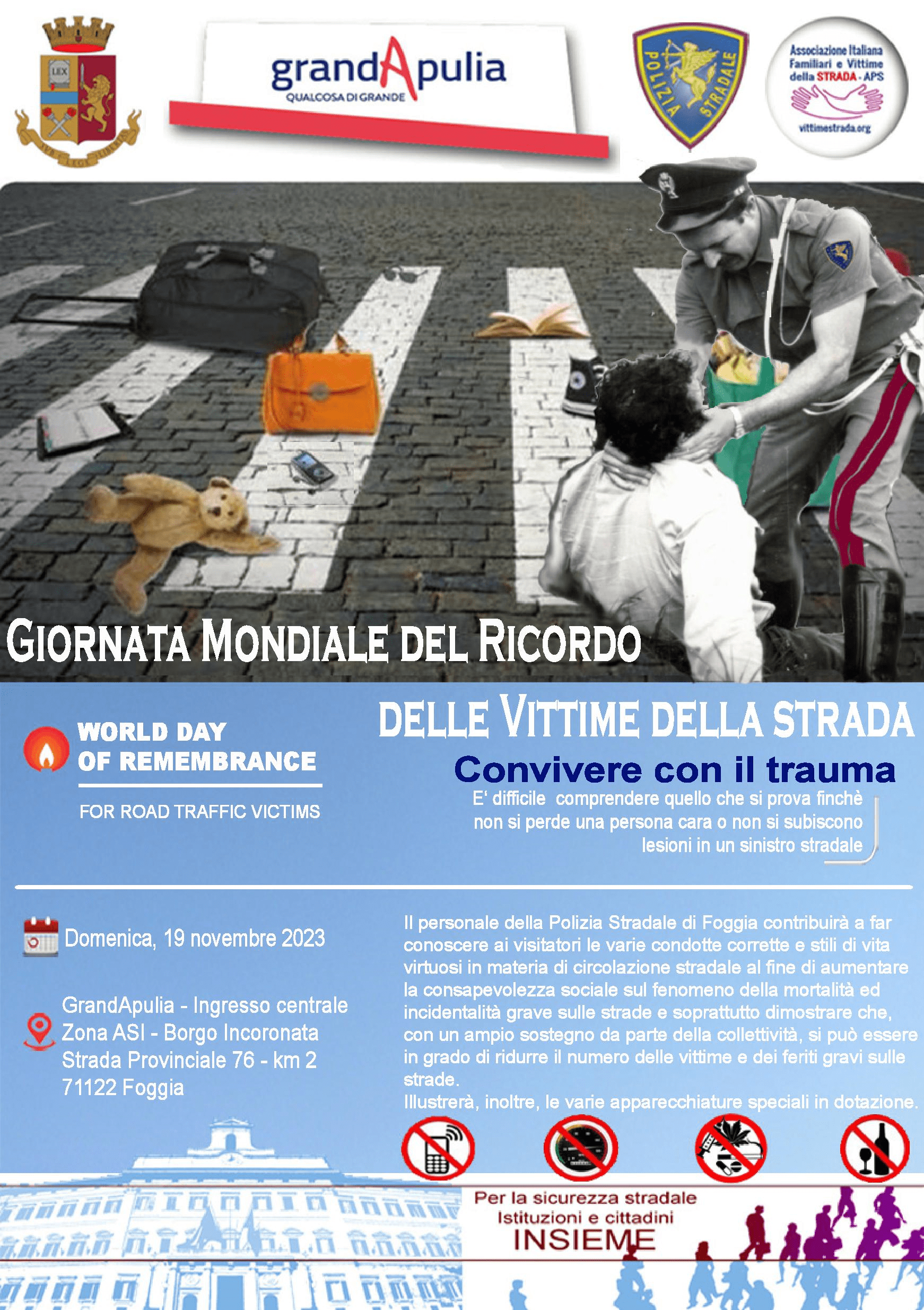 La Polizia di Stato, nella “Giornata mondiale delle vittime della strada” sarà presente domani 19 novembre dalle ore 10:00 presso il Centro Commerciale “GRANDAPULIA” per promuovere le condotte corrette e stili di vita virtuosi in materia di circolazione stradale.