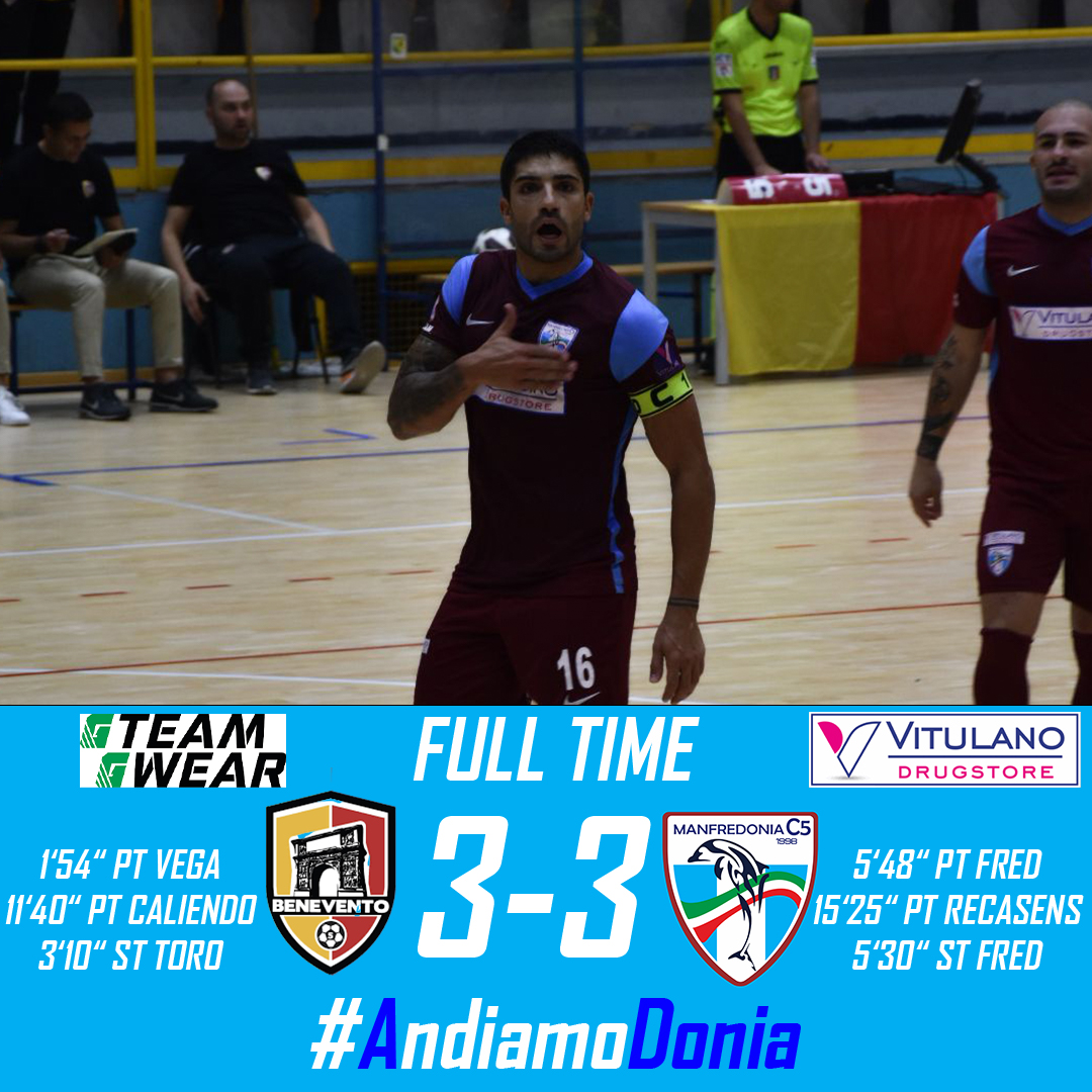 Una trasferta difficile, come ci si aspettava: finisce in parità una bella partita tra due squadre di valore, GG Teamwear Benevento e Vitulano Drugstore C5 Manfredonia. Tre reti a testa nell’anticipo della quinta giornata del Girone C di Serie A2 2022/23, svoltosi venerdì 21 ottobre al PalaTedeschi di Benevento.